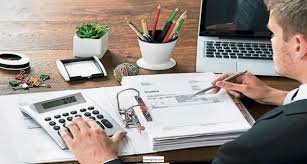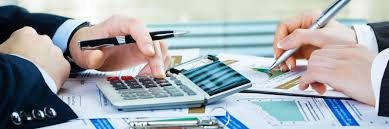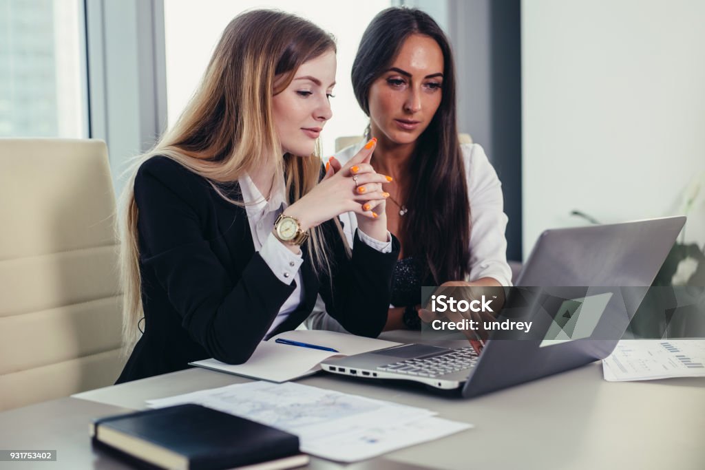 Two female accountants working together on financial report using laptop sitting at desk in account department.